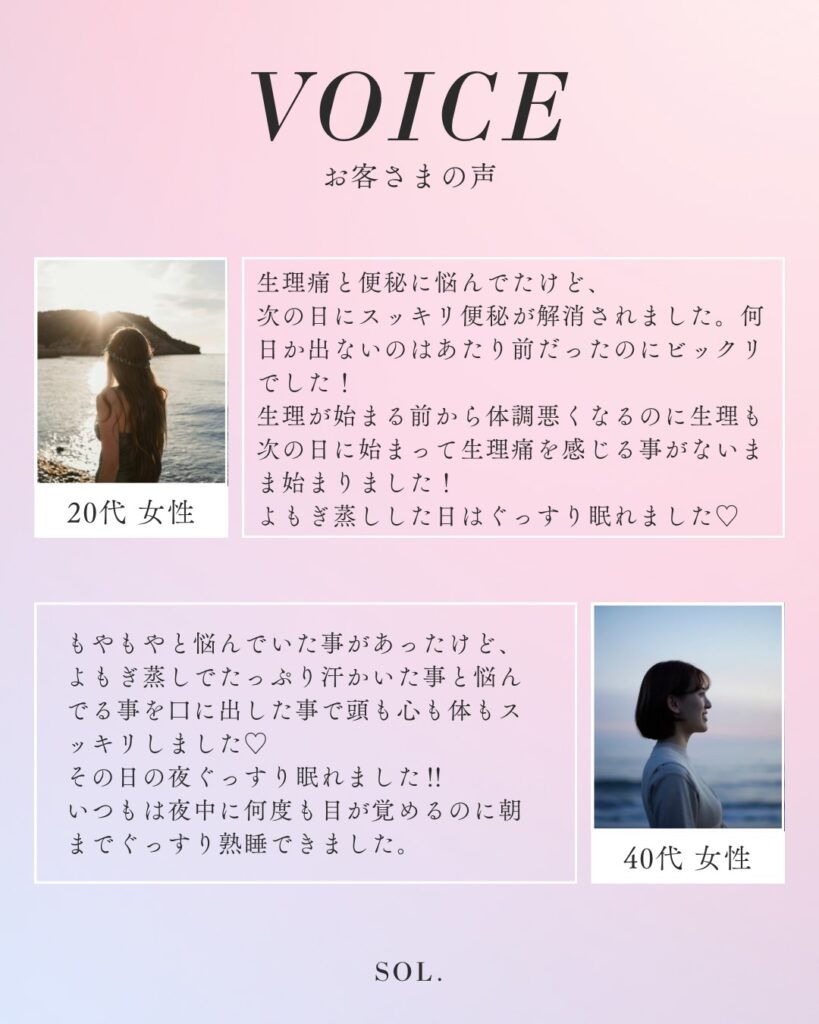 日々の疲れを癒し、自分を大切にするご褒美タイムをぜひSOL.でお過ごしください。